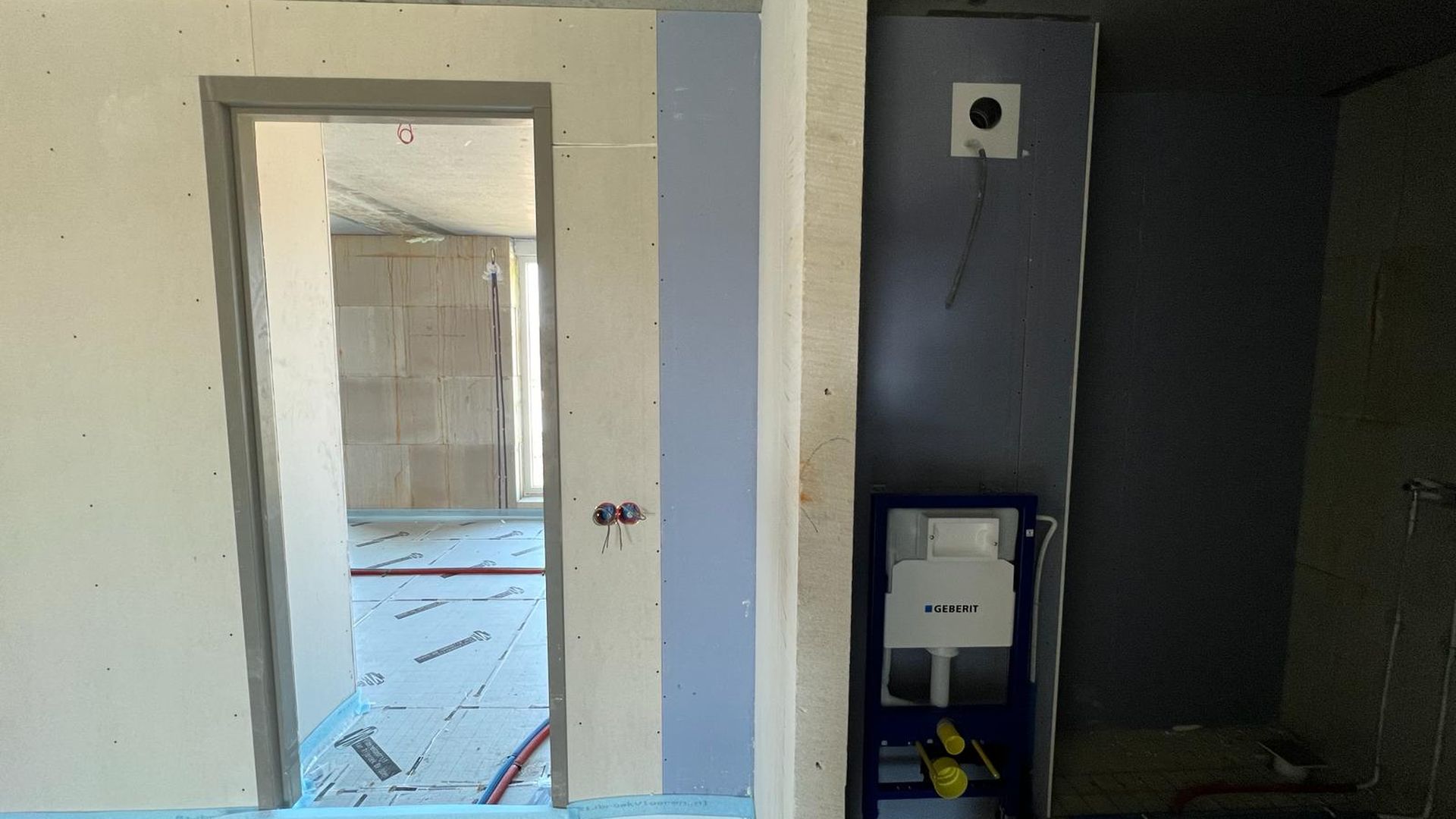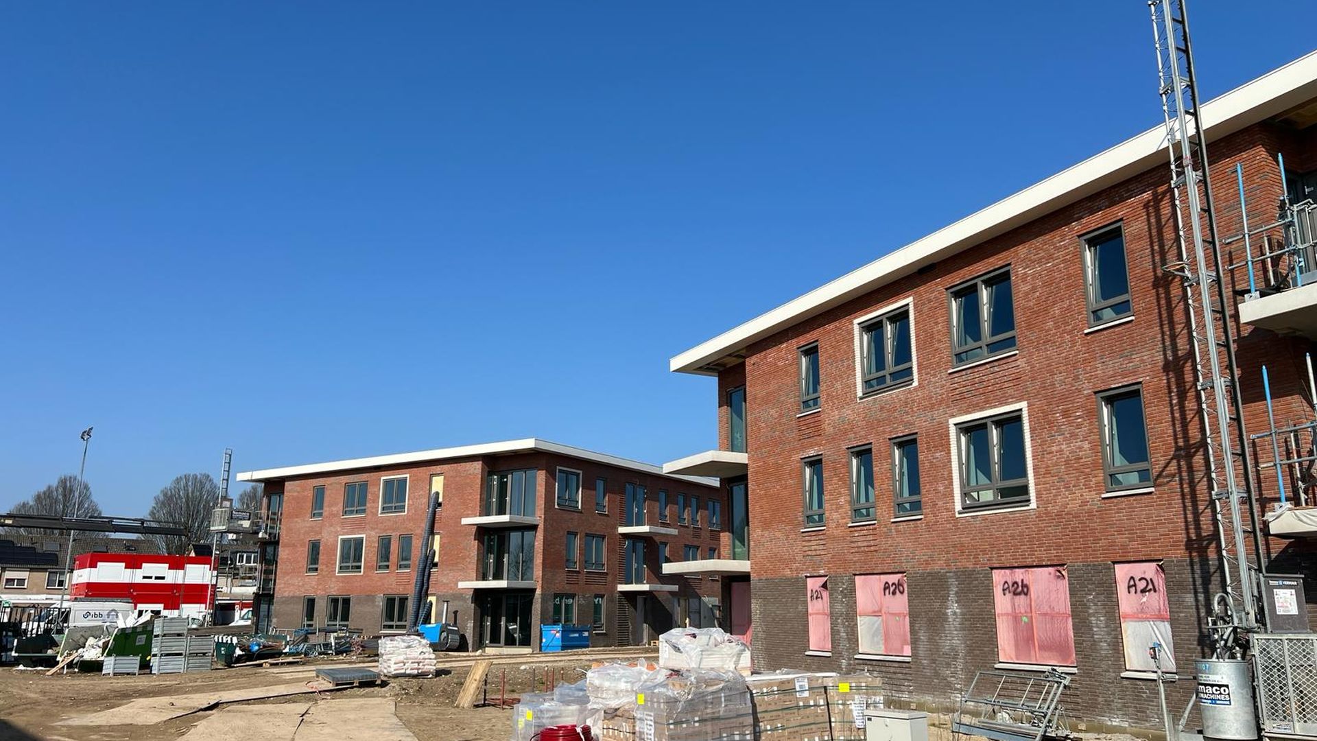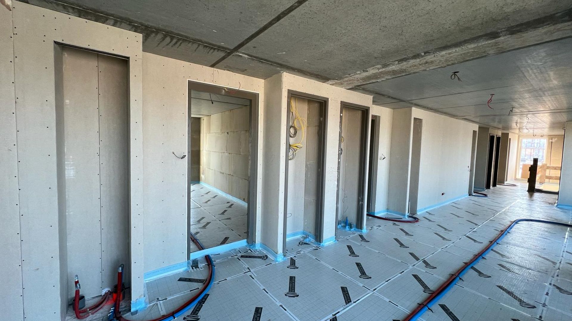 De afdeling grootbouw werkt hier aan de vloeren, binnenwanden, stukadoorwerk en het spuitwerk.